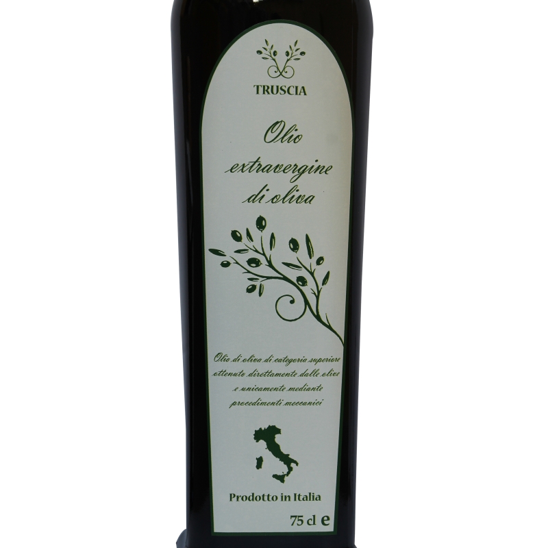 Microclima, buona coltivazione, ottima maturazione tecnologica ed estrazione a freddo di Truscia un olio dal colore verde smeraldo brillante, dall'intenso e fine fruttato di oliva verde con fresche note di erba e verdura.